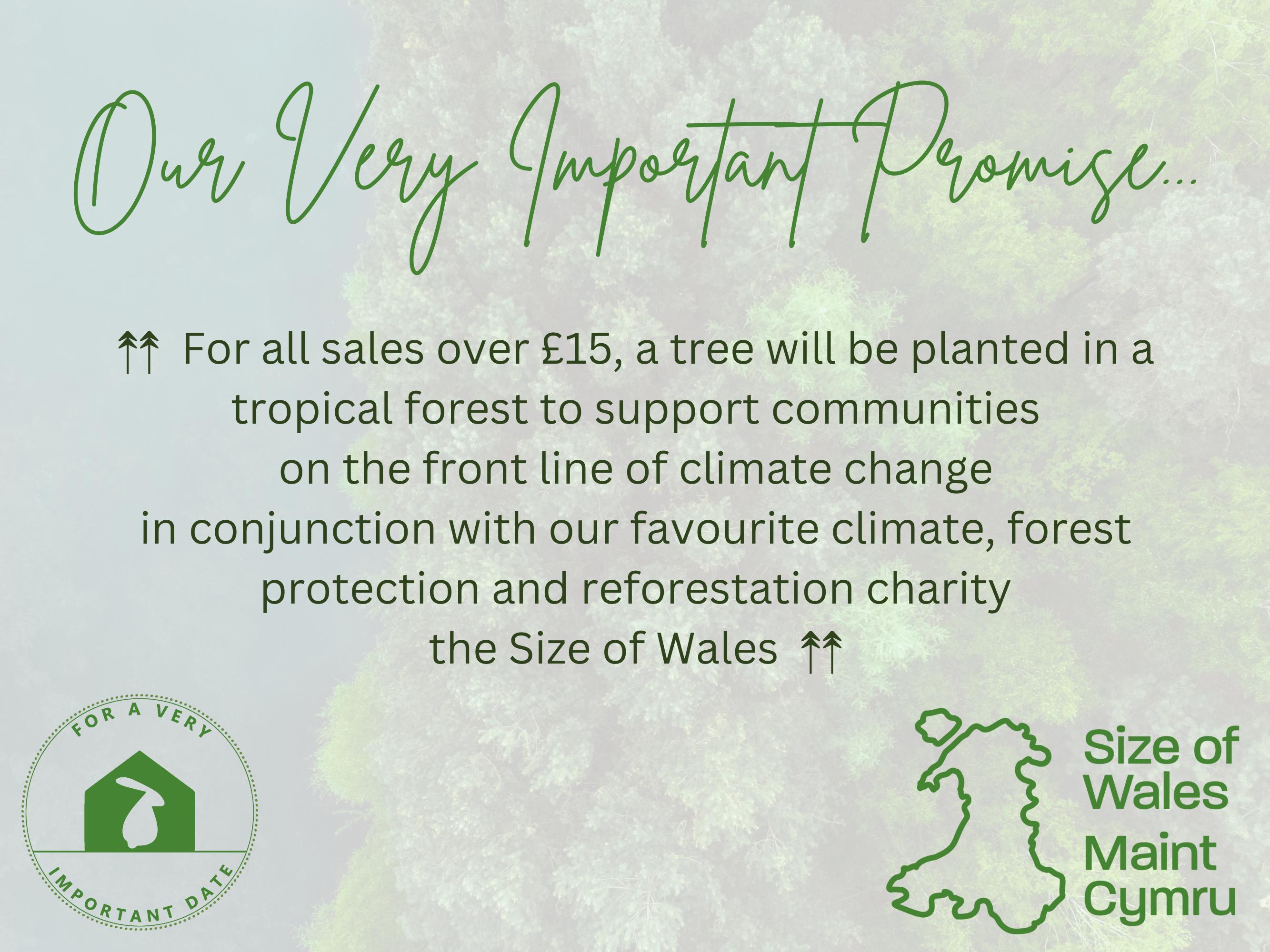 ↟↟ A tree will be planted for every sale over £15, in partnership with our favourite reforestation charity, Size of Wales ↟↟
